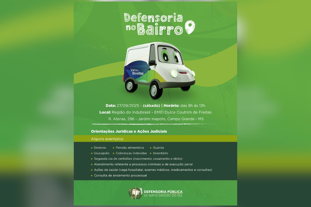 No próximo sábado (27) a Defensoria Pública de Mato Grosso do Sul promove o projeto “Defensoria no Bairro”, na região do Indubrasil. Durante a ação, a população terá acesso a orientações jurídicas e serviços gratuitos.