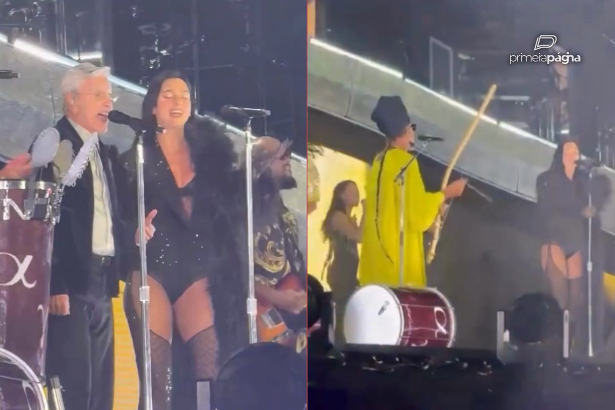 A cantora Dua Lipa trouxe a turnê “Radical Optimism” para o Brasil com o show realizado no Morumbis, em São Paulo, na noite desse sábado (15). A artista apresentou ao vivo vários hitis, falou em português e surpreendeu o público ao receber no palco Carlinhos Brown para cantar “Magalenha” e Caetano Veloso para “Margarida Perfumada” (assista abaixo).