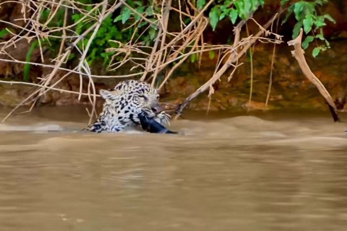 Uma onça-pintada foi flagrada ensinando sua filhote a nadar no Pantanal mato-grossense. O registro, feito em Porto Jofre, mostra a fêmea Ibaca atravessando o rio enquanto a pequena Jacy, ainda insegura, agarra-se à cauda da mãe e segue sendo puxada pela água.
