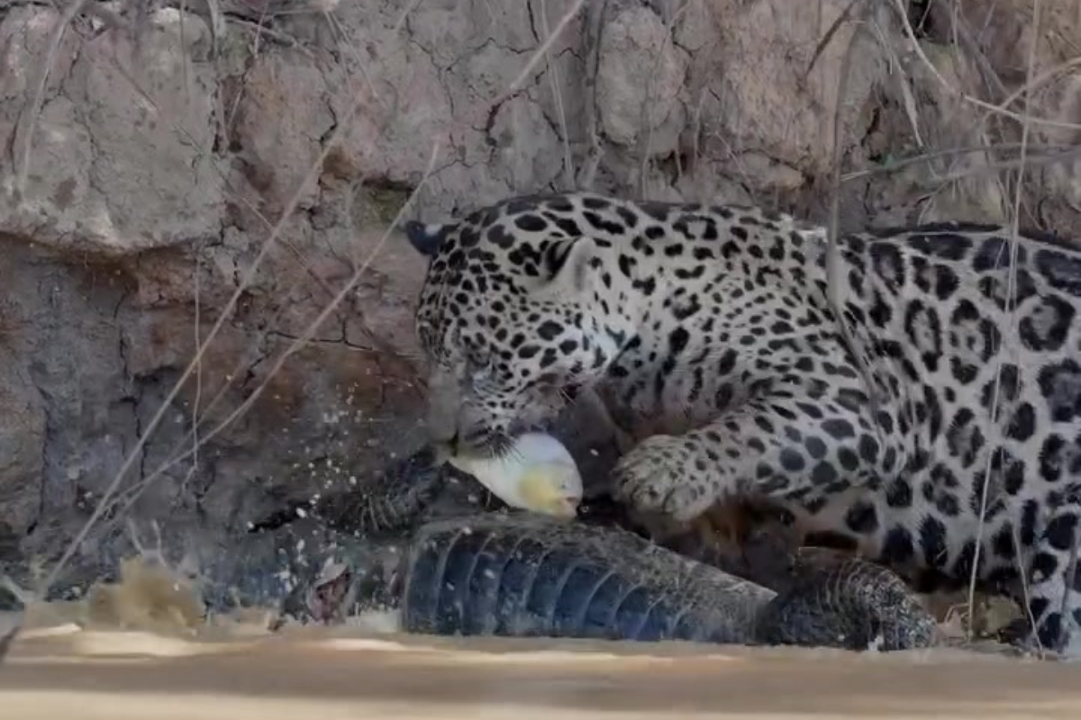 Um momento improvável uniu uma onça, um jacaré e uma piranha em um único espetáculo pantaneiro. Enquanto o felino devorava um jacaré às margens do rio, acabou “pescando” uma piranha que tentava aproveitar restos da carcaça. Uma cena rara, rápida e surpreendente até mesmo para quem conhece os hábitos da espécie.